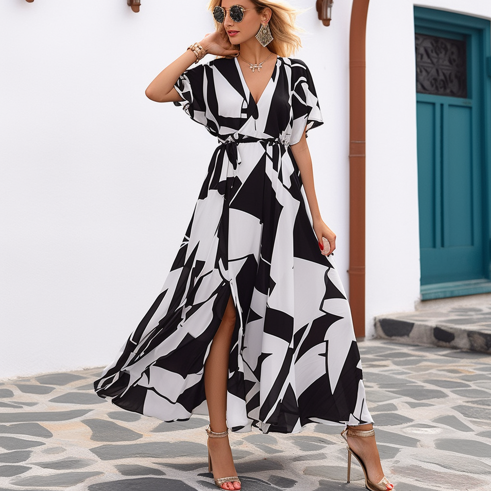 • Casual Color Block V-Neckline Maxi X-line Dress