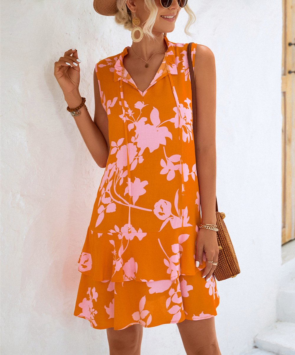 • La Mode | Orange Floral Tiered Tie Notch Neck Sleeveless Dress